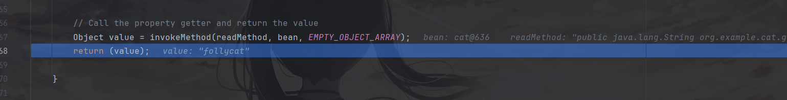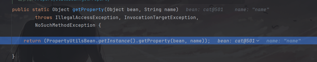 public class Main { public static void main(String[] args) throws Throwable { cat cat = new cat(); System.out.println(PropertyUtils.getProperty(cat,"name"));