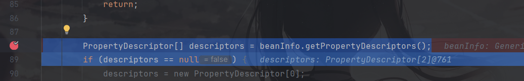 其中的getPropertyDescriptors() 方法用于获取类的所有属性的描述符。每个 PropertyDescriptor 提供了有关该属性的详细信息,包括其名称、getter 方法、setter 方法等。