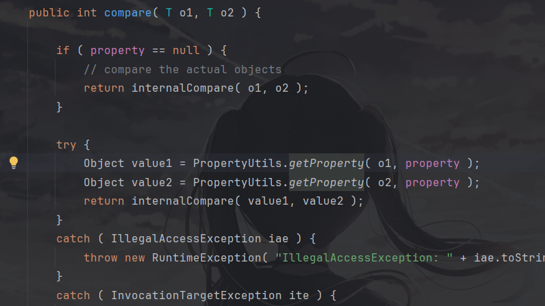 可以找到BeanComparetor的compare方法,这里调用了PropertyUtils.getProperty