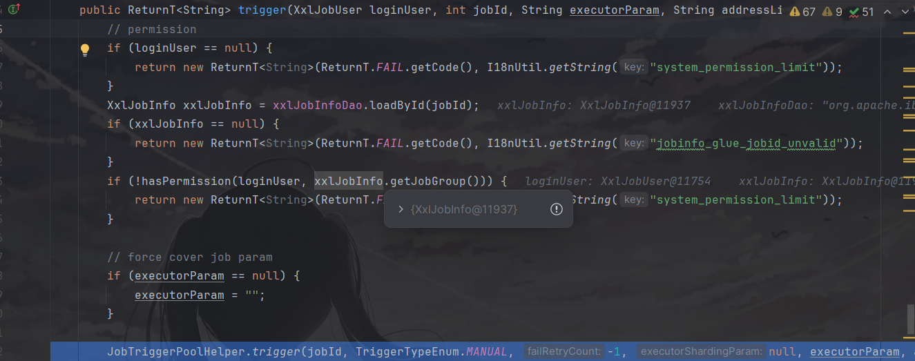 首先跟进com.xxl.job.admin.service.impl.XxlJobServiceImpl中的trigger方法。