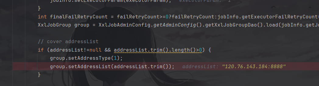 这个方法又继续在进行调用,继续跟进,因为太长了就直接跳到最后一步了,最终走到了com.xxl.job.admin.core.trigger.XxlJobTrigger中进行了参数的设置,可以看到这里用我们上传的参数覆盖了原来的addressList。