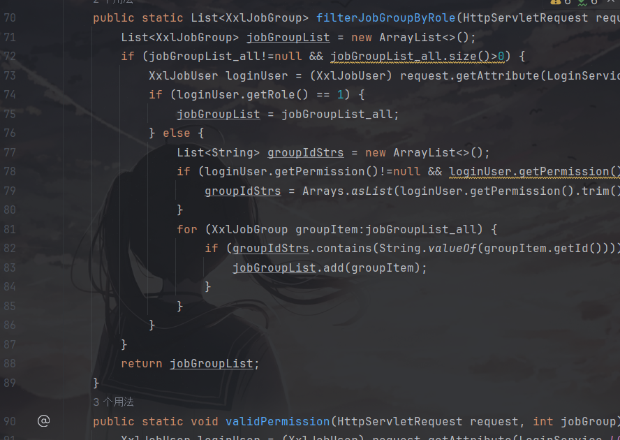 1 2 3 4 5 6 7 8 9 10 11 12 13 14 15 16 17 18 19 20 21 22 23 24 25 26 27 28 29 30 31 32 33 34 35 36 37 public static List<XxlJobGroup> filterJobGroupByRole(HttpServletRequest request, List<XxlJobGroup> jobGroupList_all){ // 创建一个空的列表,用于存储过滤后的组 List<XxlJobGroup> jobGroupList = new ArrayList<>(); // 如果传入的列表不为空且大小大于0 if (jobGroupList_all != null && jobGroupList_all.size() > 0) { // 获取当前登录用户对象,存储在请求的属性中,LOGIN_IDENTITY_KEY 是常量表示用户身份信息 XxlJobUser loginUser = (XxlJobUser) request.getAttribute(LoginService.LOGIN_IDENTITY_KEY); // 检查用户角色,如果角色是 1,则表示是管理员,管理员可以看到所有组 if (loginUser.getRole() == 1) { // 如果是管理员,直接返回所有的组 jobGroupList = jobGroupList_all; } else { // 如果不是管理员,创建一个列表用于存储用户拥有权限的组 ID List<String> groupIdStrs = new ArrayList<>(); // 如果用户的权限字符串不为空,解析出权限字符串并分割为一个列表 if (loginUser.getPermission() != null && loginUser.getPermission().trim().length() > 0) { // 将权限字符串(以逗号分隔)转换为列表 groupIdStrs = Arrays.asList(loginUser.getPermission().trim().split(",")); } // 遍历所有的组列表 for (XxlJobGroup groupItem : jobGroupList_all) { // 如果当前组的 ID 存在于用户的权限列表中,则加入到返回的列表中 if (groupIdStrs.contains(String.valueOf(groupItem.getId()))) { jobGroupList.add(groupItem); } } } } // 返回过滤后的组列表 return jobGroupList; }