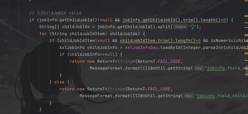 1 2 3 4 5 6 7 8 9 10 11 12 13 14 if (jobInfo.getChildJobId()!=null && jobInfo.getChildJobId().trim().length()>0) { String[] childJobIds = jobInfo.getChildJobId().split(","); for (String childJobIdItem: childJobIds) { if (childJobIdItem!=null && childJobIdItem.trim().length()>0 && isNumeric(childJobIdItem)) { XxlJobInfo childJobInfo = xxlJobInfoDao.loadById(Integer.parseInt(childJobIdItem)); if (childJobInfo==null) { return new ReturnT<String>(ReturnT.FAIL_CODE, MessageFormat.format((I18nUtil.getString("jobinfo_field_childJobId")+"({0})"+I18nUtil.getString("system_not_found")), childJobIdItem)); } } else { return new ReturnT<String>(ReturnT.FAIL_CODE, MessageFormat.format((I18nUtil.getString("jobinfo_field_childJobId")+"({0})"+I18nUtil.getString("system_unvalid")), childJobIdItem)); } }