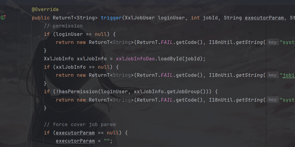 1 2 3 4 5 6 7 8 9 10 11 12 13 14 15 16 17 18 19 20 21 public ReturnT<String> trigger(XxlJobUser loginUser, int jobId, String executorParam, String addressList) { // permission if (loginUser == null) { return new ReturnT<String>(ReturnT.FAIL.getCode(), I18nUtil.getString("system_permission_limit")); } XxlJobInfo xxlJobInfo = xxlJobInfoDao.loadById(jobId); if (xxlJobInfo == null) { return new ReturnT<String>(ReturnT.FAIL.getCode(), I18nUtil.getString("jobinfo_glue_jobid_unvalid")); } if (!hasPermission(loginUser, xxlJobInfo.getJobGroup())) { return new ReturnT<String>(ReturnT.FAIL.getCode(), I18nUtil.getString("system_permission_limit")); } // force cover job param if (executorParam == null) { executorParam = ""; } JobTriggerPoolHelper.trigger(jobId, TriggerTypeEnum.MANUAL, -1, null, executorParam, addressList); return ReturnT.SUCCESS; }