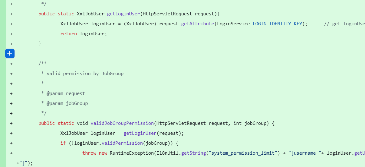 1 2 3 4 5 6 7 8 9 10 public static void validPermission(HttpServletRequest request, int jobGroup) { // 从请求对象中获取当前登录的用户 XxlJobUser loginUser = (XxlJobUser) request.getAttribute(LoginService.LOGIN_IDENTITY_KEY); // 调用 loginUser 的 validPermission 方法来验证用户是否有权限访问指定的组 if (!loginUser.validPermission(jobGroup)) { // 如果用户没有权限,抛出运行时异常,并将错误信息拼接上用户名 throw new RuntimeException(I18nUtil.getString("system_permission_limit") + "[username=" + loginUser.getUsername() + "]"); } }