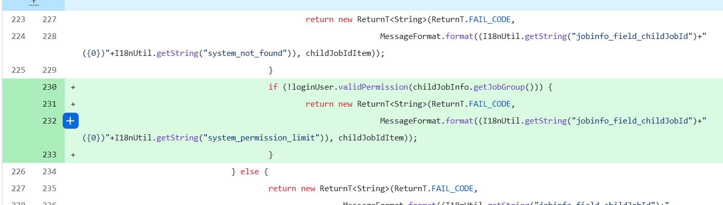 1 2 3 4 5 if (!loginUser.validPermission(childJobInfo.getJobGroup())) { return new ReturnT<String>(ReturnT.FAIL_CODE, MessageFormat.format((I18nUtil.getString("jobinfo_field_childJobId")+"({0})"+I18nUtil.getString("system_permission_limit")), childJobIdItem)); }