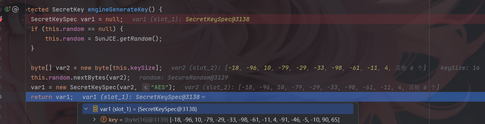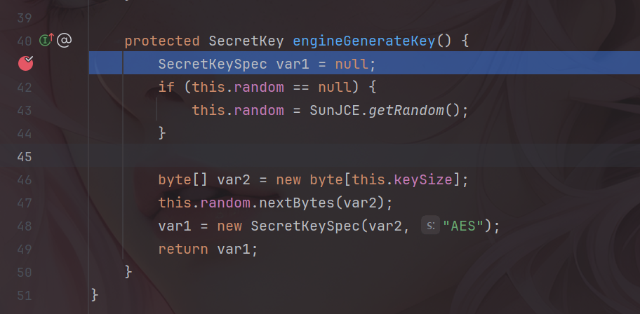 其进行了一个初始化的操作,其中engineInit方法用于初始化 AES 加密引擎,继续调试,在engineGenerateKey方法中下一个断点。