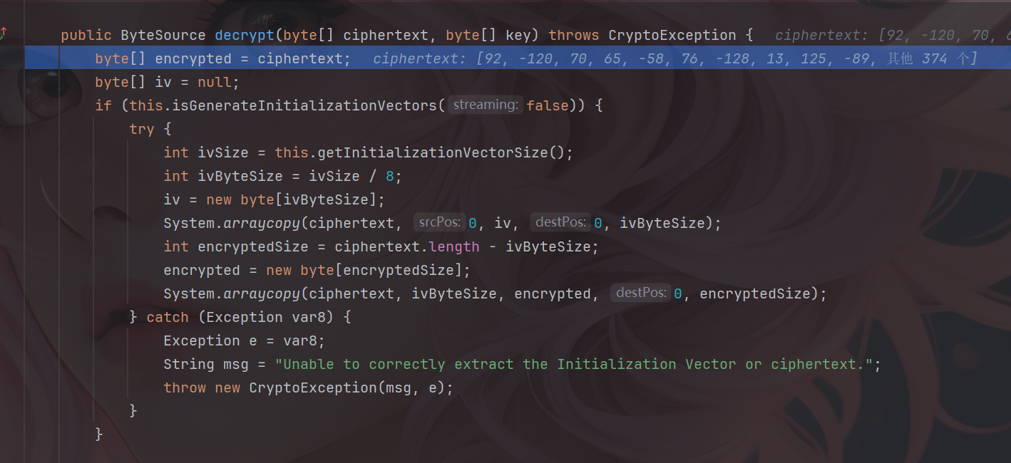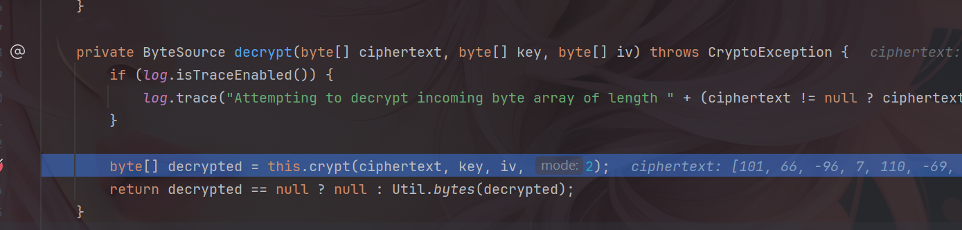 这个方法用于解密操作,并提取初始化iv,继续跟进到下一个decrypt中。