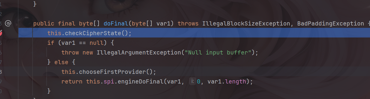 跟进到doFinal,可以发现其有两个异常处理,分别用于捕获块大小异常和填充错误异常。