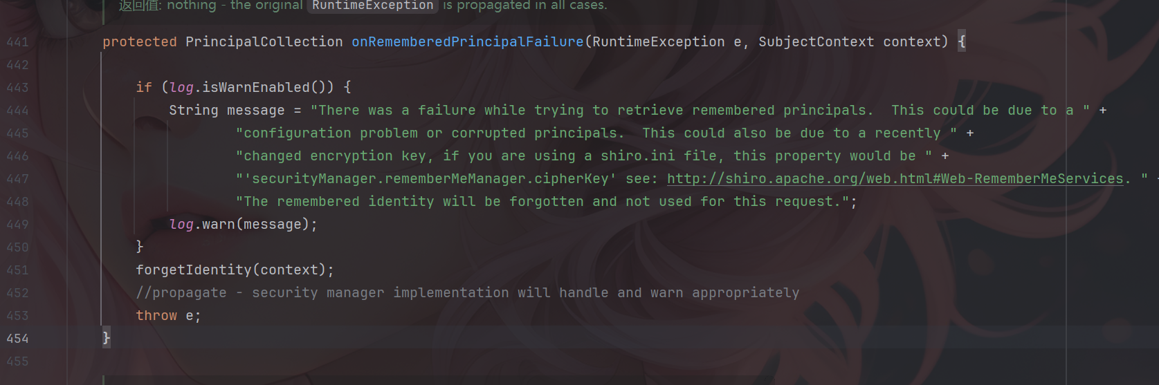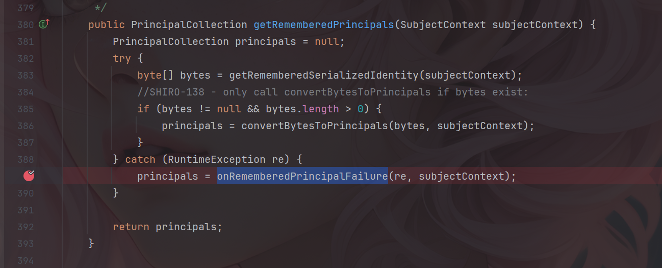 如果出现异常的话将会被抛出到crypt() 方法中,并且进入onRememberedPrincipalFailure方法。
