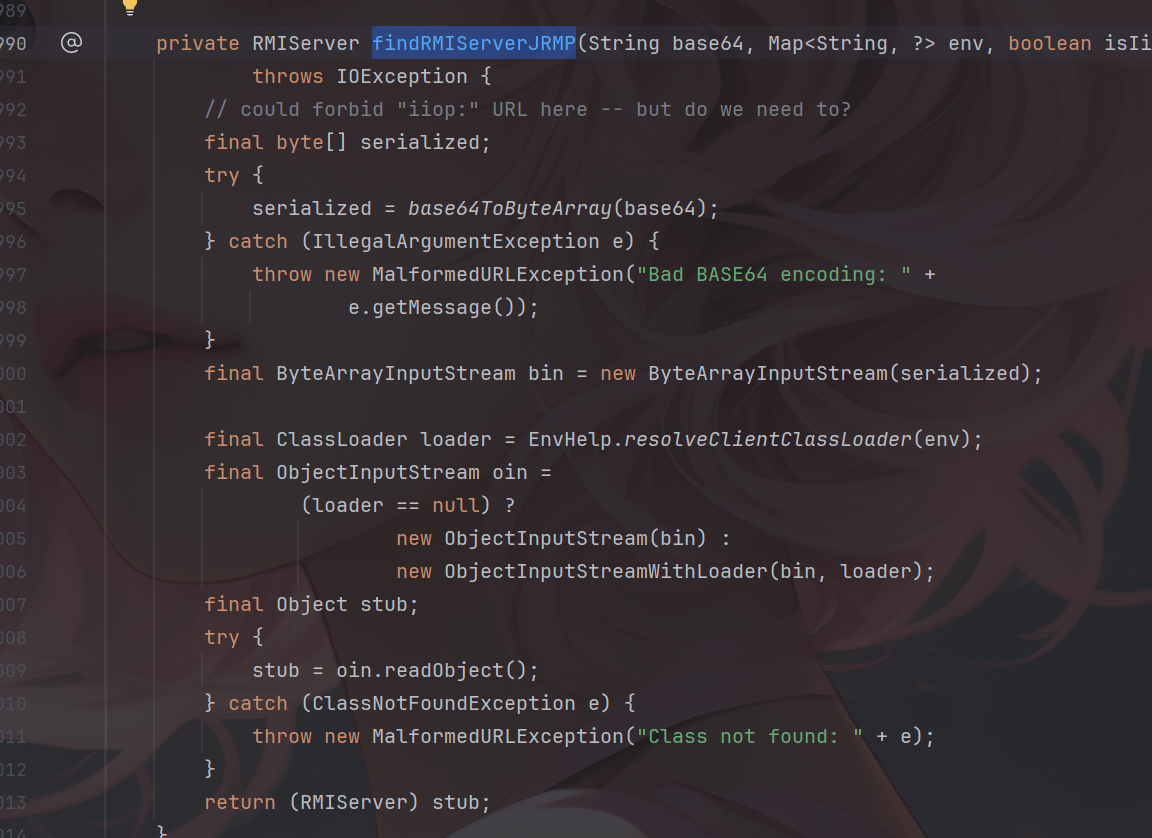 可以发现其接受一个base64的字符串并将其解密并进行了反序列化操作,也就是oin.readObject();继续向上找谁调用了findRMIServerJRMP,并且传入的base64是可控的,找到findRMIServer这个方法。