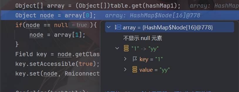 这里需要注意一点的就是key的设置,由于这里没有TiedMapEntry,所以key是无法直接反射进行传参的,并且LazyMap是基于hashMap1和hashMap2进行懒加载的,所以在实际储存和访问key时需要先反射来访问hashMap1中的table数组,从中获取到我们需要修改的key的Node对象(这个对象中包含了key和value),对该node对象进行反射修改key。