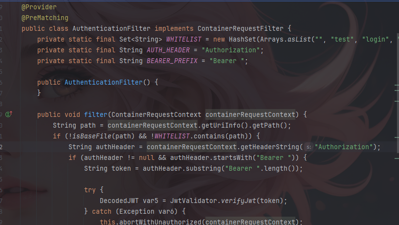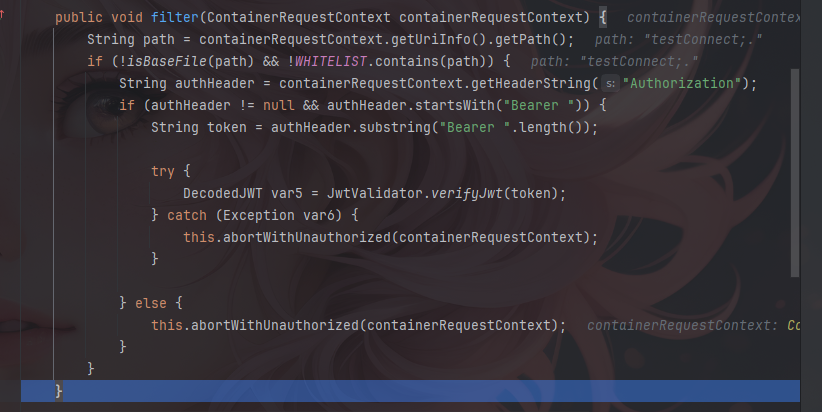 这是基于ContainerRequestContext实现的获取请求Path的方法,并且使用的是getUriInfo().getPath();这会直接返回请求的路径部分,比如请求为http://127.0.0.1/api/test;test,将会直接返回api/test;test/,因此可以利用该特性来进行绕过鉴权的操作。