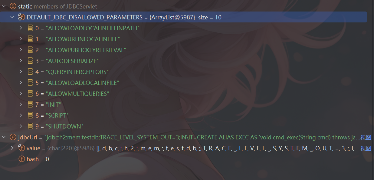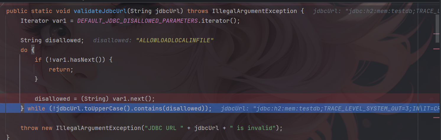 这段代码主要实现了数据库的连接测试操作,并且其中有一些过滤以及限制,首先其接收jdbcUrl参数,并且要求其以jdbc:h2开头,然后会在结尾加上;FORBID_CREATION=TRUE这一字符串,这段字符主要作用是禁止创建数据库,这里是需要绕过的,看p神的文章中是因为只要将分号使用反斜线转义,分号就会变成一个普通字符串。