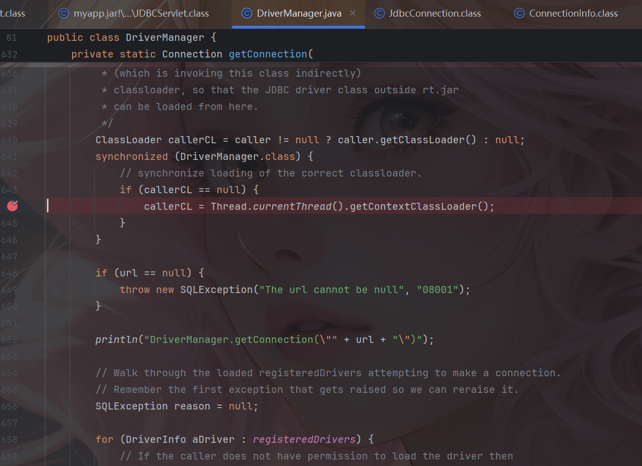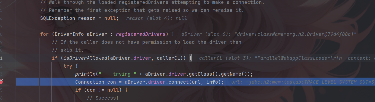 提前在DriverManager方法中打下断点,因为DriverManager.getConnection这里是无法打下断点的。