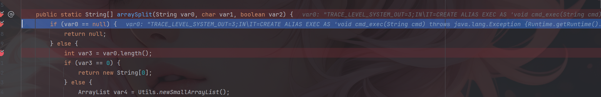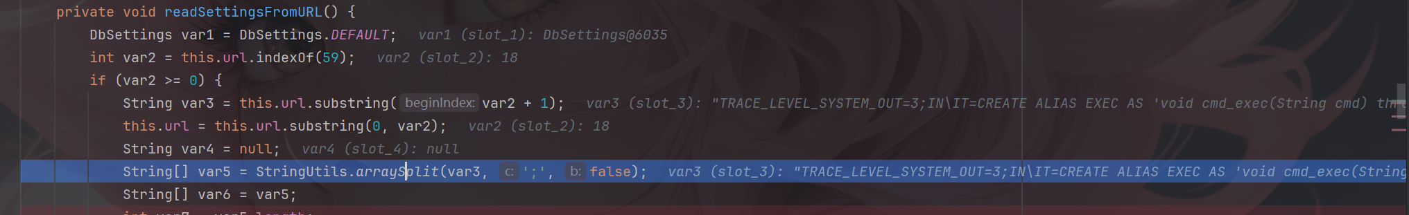 这个H2的RCE漏洞的问题就是在于这个字符串提取和处理这里,进入arraySplit方法中。