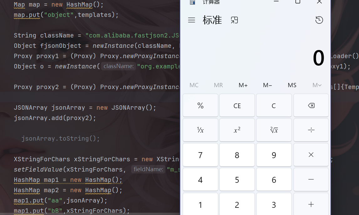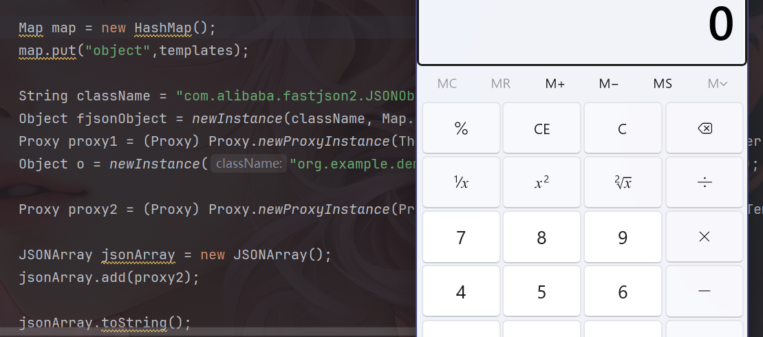 String className = "com.alibaba.fastjson2.JSONObject"; Object fjsonObject = newInstance(className, Map.class,map); Proxy proxy1 = (Proxy) Proxy.newProxyInstance(Thread.currentThread().getContextClassLoader(), new Class[]{MyObject.class}, (InvocationHandler)fjsonObject); Object o = newInstance("org.example.demo.Utils.MyProxy", MyObject.class,proxy1);