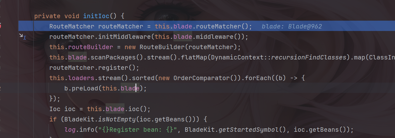 他们都是0,这是因为我们没有获取当前正在执行的Blade实例,因此这个创建操作是基本无效的,因此需要获取当前正在运行的Blade实例,并通过反射获取routeMatcher的值。