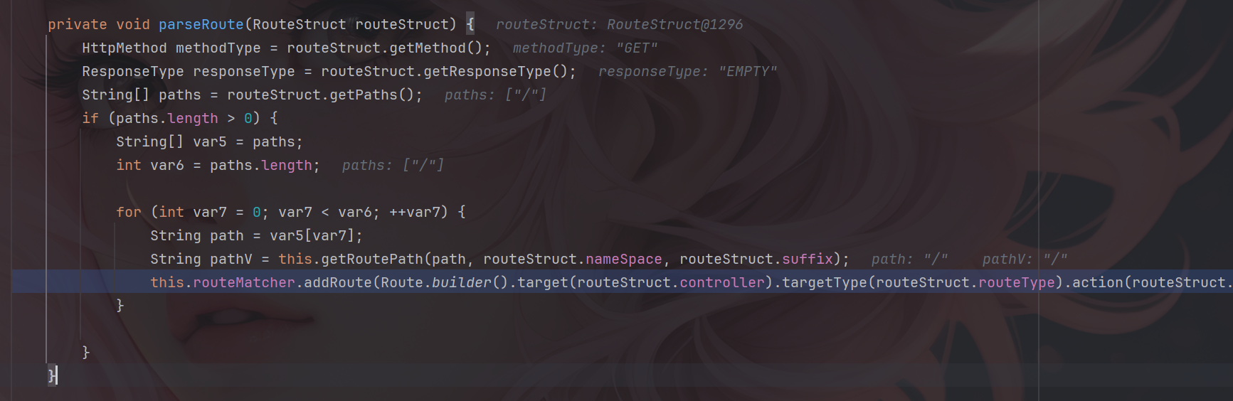 阅读这段代码可以发现route被添加到了routes这个Map中,因此我们需要构造一个route并调用routeMatcher.addRoute方法进行添加。