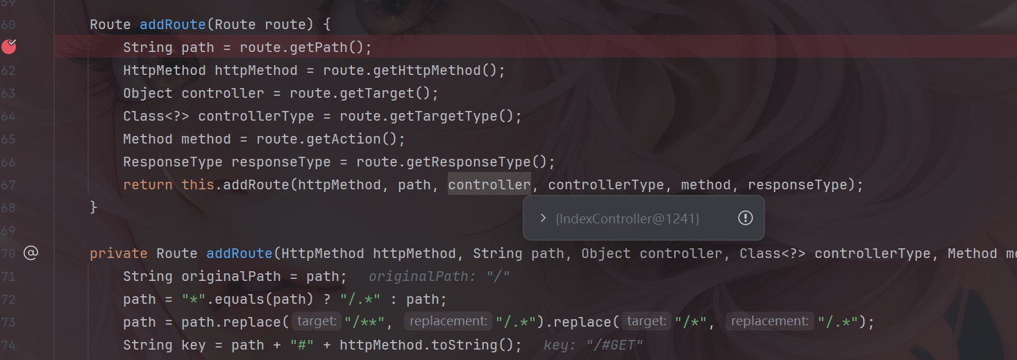1 2 3 4 5 6 7 8 9 10 11 12 13 14 15 16 17 18 19 20 21 22 23 24 25 26 27 28 29 30 31 32 33 34 35 36 37 38 39 Route addRoute(Route route) { String path = route.getPath(); HttpMethod httpMethod = route.getHttpMethod(); Object controller = route.getTarget(); Class<?> controllerType = route.getTargetType(); Method method = route.getAction(); ResponseType responseType = route.getResponseType(); return this.addRoute(httpMethod, path, controller, controllerType, method, responseType); } private Route addRoute(HttpMethod httpMethod, String path, Object controller, Class<?> controllerType, Method method, ResponseType responseType) { String originalPath = path; path = "*".equals(path) ? "/.*" : path; path = path.replace("/**", "/.*").replace("/*", "/.*"); String key = path + "#" + httpMethod.toString(); if (this.routes.containsKey(key)) { log.warn("\tRoute {} -> {} has exist", path, httpMethod.toString()); } Route route = new Route(httpMethod, originalPath, path, controller, controllerType, method, responseType); if (BladeKit.isWebHook(httpMethod)) { Order order = (Order)controllerType.getAnnotation(Order.class); if (null != order) { route.setSort(order.value()); } if (this.hooks.containsKey(key)) { ((List)this.hooks.get(key)).add(route); } else { List<Route> empty = new ArrayList(); empty.add(route); this.hooks.put(key, empty); } } else { this.routes.put(key, route); } return route; }